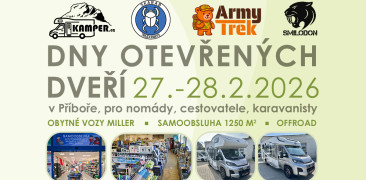 Zveme vás do Příbora na Dny otevřených dveří 27. - 28. února 2026. Čeká vás prezentace nově rozšířené samoobslužné prodejny, obytných vozů Miller a outdoor/army sortimentu včetně naší značky Smilodon. Číst více