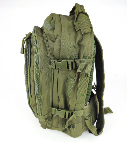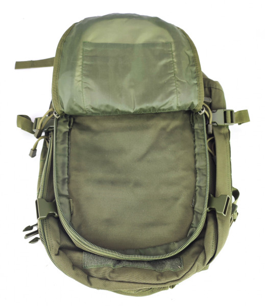 Velký batoh ve vojenském stylu o objemu 45 l. Batoh disponuje velkým množstvím kapes, přičemž největší kapsa má přihrádku na notebook. Ze spodu popruhy na spacák. Je vyroben z kvalitního pevného materiálu (100% polyester) s voděodolnou úpravou. Ideální batoh v military stylu na výlety do přírody. Dvoucestné zipy.