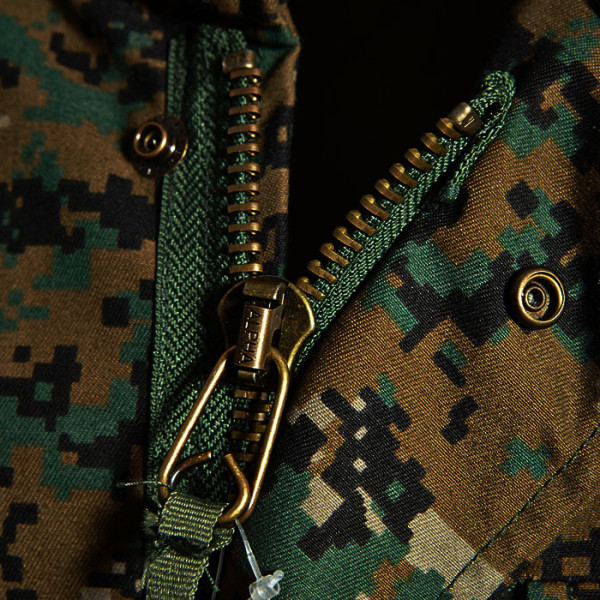 Maskáčová bunda v armádním stylu ve střihu M65 s vyjímatelnou prošívanou vložkou. V kamufláži woodland digital. Díky vložce lze bundu použít v zimě, bez vložky pak na jaře a podzim.