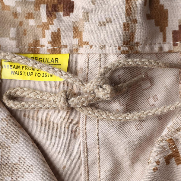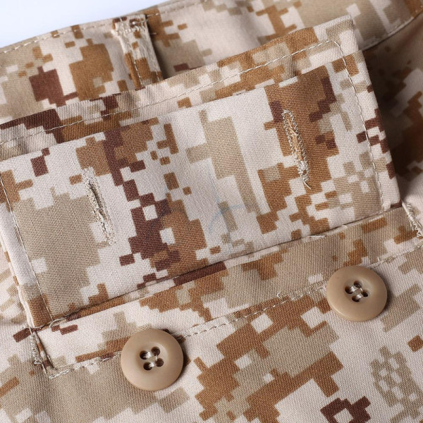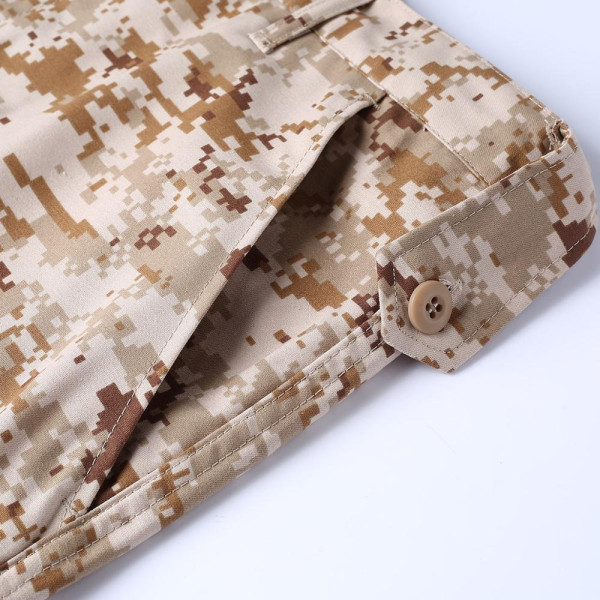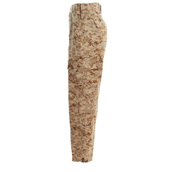 Kalhoty podle střihu ACU (assault combat uniform) v kamufláži desert digital. Textilní úprava ripstop. Materiál 35 % bavlna, 65 % polyester, 210-220 g/m².