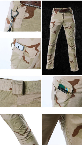 Taktické kalhoty v military stylu v pouštní kamufláži. Kalhoty jsou lehké, pohodlné a přesto velice odolné - vyrobeno z tkaniny rip-stop. Velké množství kapes a elastický pas. Posílená kolena. Pásek není součástí. Materiál 35 % bavlna, 65 % polyester, 210-220 g/m².Více informací