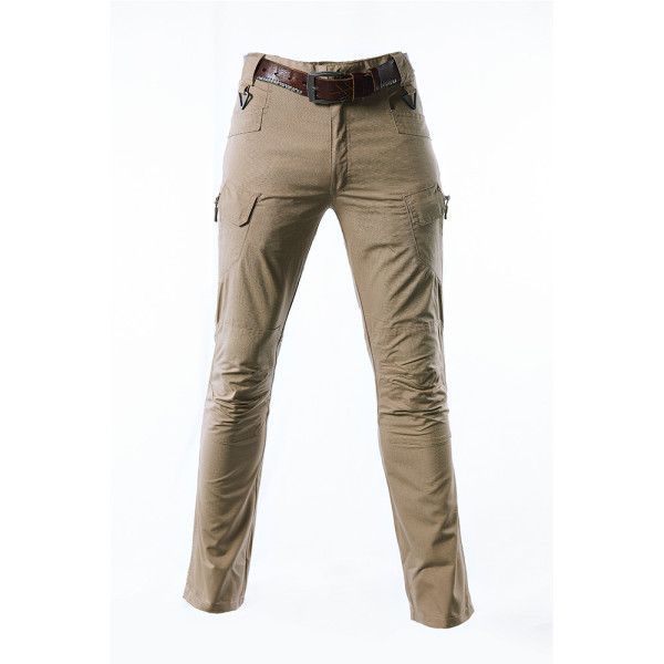 Taktické kalhoty v military stylu v khaki barvě. Kalhoty jsou lehké, pohodlné a přesto velice odolné - vyrobeno z tkaniny rip-stop. Velké množství kapes a elastický pas. Posílená kolena. Materiál 35 % bavlna, 65 % polyester, 210-220 g/m².