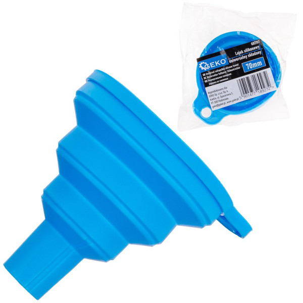 Leeje je vyrobený z odolného silikonu, který je flexibilní, chemicky odolný a snadno omyvatelný. Průměr 70 mm umožňuje pohodlné přelévání olejů, paliva, chladicích kapalin nebo jiných tekutin do úzkých hrdlových otvorů bez nechtěného rozlití. Skládací konstrukce ti ušetří místo v kufru auta, dílně nebo garáži.
