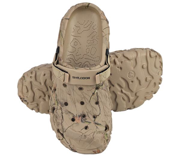 Lehké a odolné gumové nazouváky Smilodon v béžové lesní kamufláži. Univerzální EVA obuv pro pohodlné nošení doma, na zahradě i při volnočasových aktivitáchVíce informací