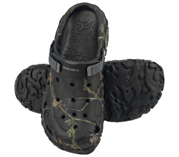 Lehké a odolné gumové nazouváky Smilodon v černé lesní kamufláži. Univerzální EVA obuv pro pohodlné nošení doma, na zahradě i při volnočasových aktivitáchVíce informací