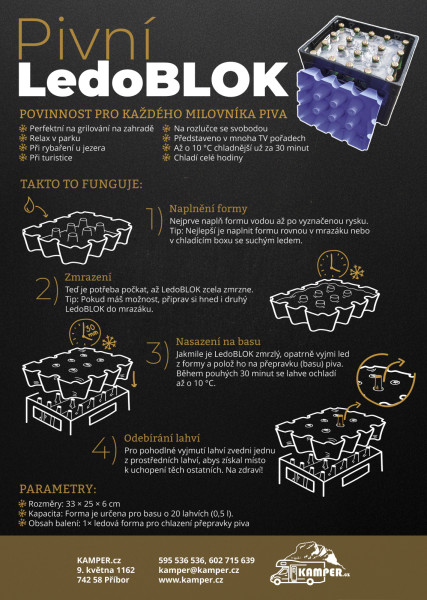 Pivní LedoBLOK – nezbytný doplněk pro všechny milovníky piva. Chcete si dopřát opravdu vychlazené pivo kdykoliv a kdekoliv? Pivní LedoBLOK je ideálním řešením pro každou grilovačku, zahradní oslavu i posezení s přáteli. Jednoduše ho zmrazíte a během chvilky udržíte celou přepravku piv v perfektní teplotě.Více informací
