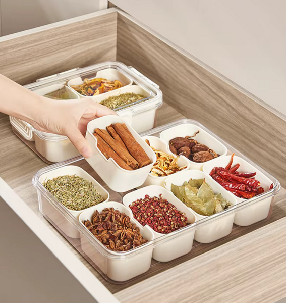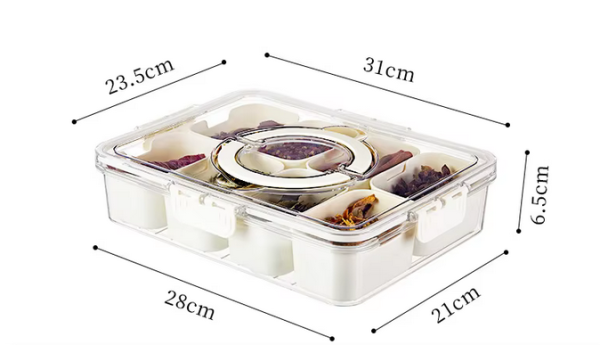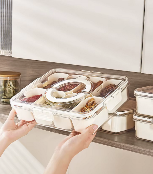 Praktický úložný box na svačiny a pochutiny s víkem, rukojetí a dělenými přihrádkami. Multifunkční, přenosný a vhodný pro moderní kuchyňskou organizaci.Více informací