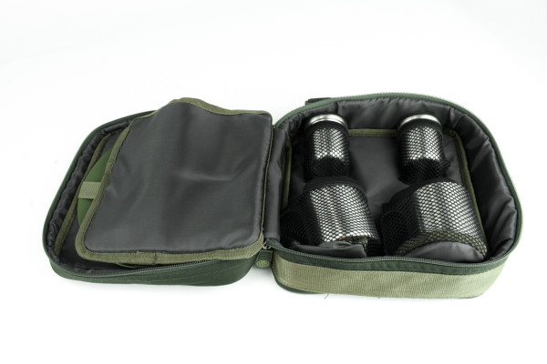 Jídelní sada ideální pro rybáře obsahující příbory, ubrousky/ručníky a je zabalena v praktickém textilním pouzdře.