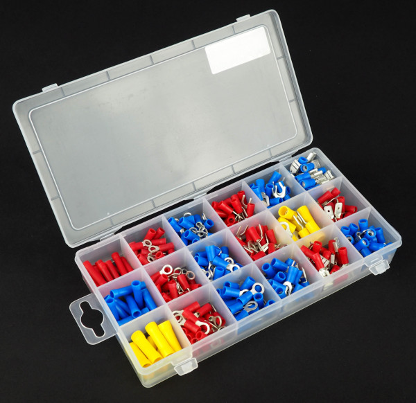 Sada elektro konektorů pro elektrikáře – 360 ks. Obsahuje očka, vidličky, konektory, dutinky, spojky. Sada pro každého elektrikáře či kutila, krimpovací konektory upotřebíte jak v domácnosti, tak v garáži nebo při elektroinstalacích rozvodů domů či v rozvaděčích. Slouží především jako zakončení lankového vodiče pod šroub či do svorkovnice. Konektory jsou krimpovací (zamačkavací) a jsou určeny pro lankové měděné vodiče. Zamačkávání dutinek se provádí krimpovacími kleštěmi nebo kombinačkami.