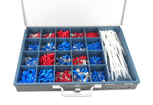 Sada obsahuje 630 ks elektro konektorů a stahovacích pásků, uložených v praktickém plechovém kufru.