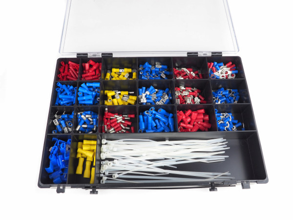 Sada elektro konektorů pro elektrikáře – 630 ks. Obsahuje očka, vidličky, konektory, dutinky, spojky. Sada pro každého elektrikáře či kutila, krimpovací konektory upotřebíte jak v domácnosti, tak v garáži nebo při elektroinstalacích rozvodů domů či v rozvaděčích. Slouží především jako zakončení lankového vodiče pod šroub či do svorkovnice. Konektory jsou krimpovací (zamačkavací) a jsou určeny pro lankové měděné vodiče. Zamačkávání dutinek se provádí krimpovacími kleštěmi nebo kombinačkami.