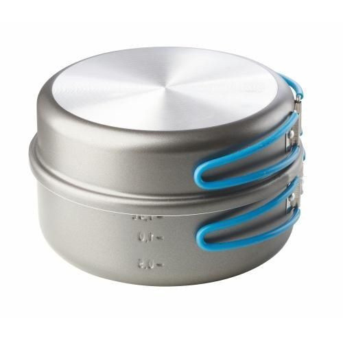 Campingová sada nádobí s nepřilnavým povrchem PTFE-vyrobena z povlakovaného hliníku.