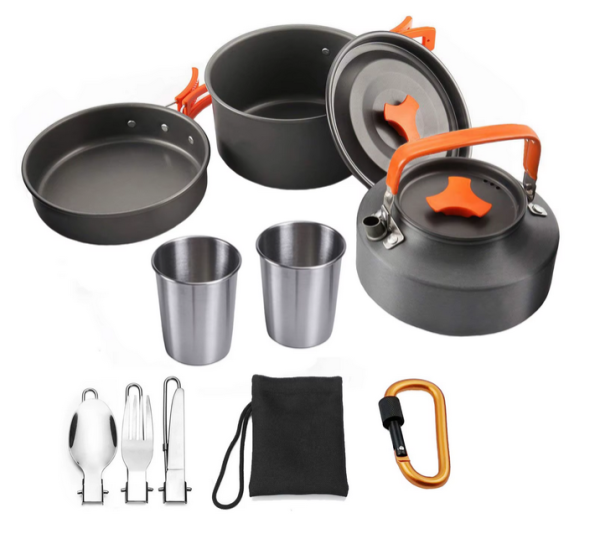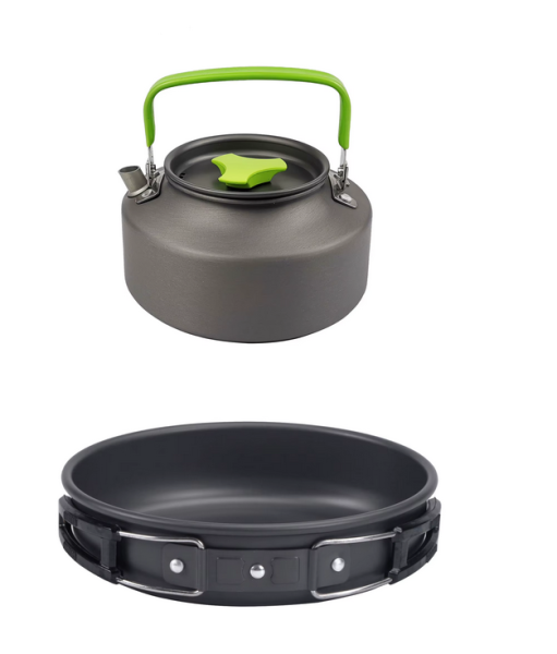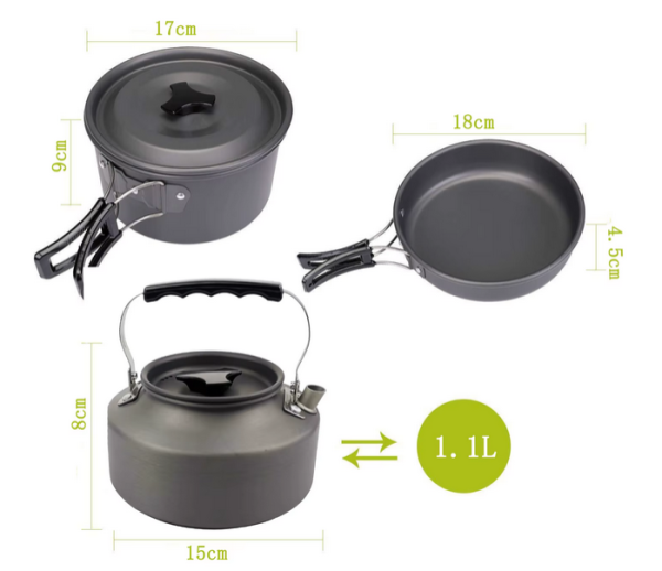 Praktická sada nádobí s konvicí je ideální pro 2–3 osoby při kempování, turistice nebo cestování. Vyrobena z lehkého, ale odolného kovu s hliníkovým víkem, zaručuje dlouhou životnost a snadné čištění. Celá sada je skladná, lehce přenosná a dodává se v obalu pro pohodlný transport.Více informací