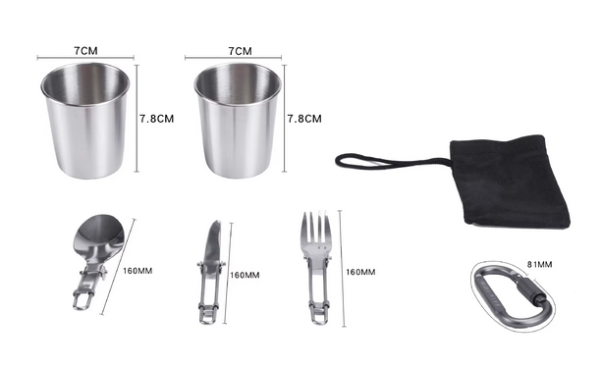 Doplňky (kovové hrnky, skládací příbory, karabina, obal)