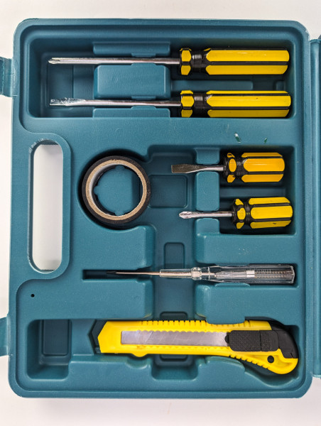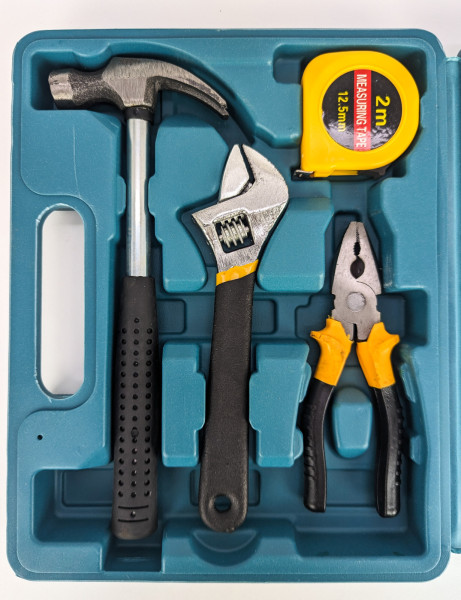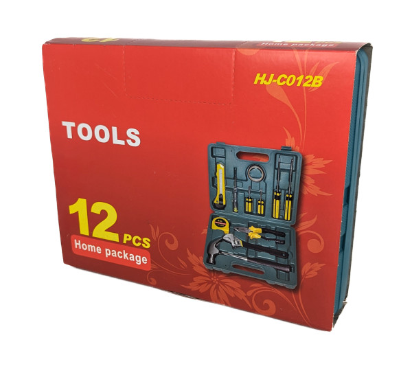 Sada nářadí pro použití v domácnosti. Obsahuje celkem 12 nástrojů a doplňků, které umožňují provádět různé druhy prací. Tato sada obsahuje následující položky: kladivo, šroubováky křížové i ploché, kleště, klíč, řezací nůž, svinovací metr, PVC páska a zkoušečka napětí. Veškeré příslušenství je prakticky uschováno v kufříku, což zajišťuje snadné uspořádání nástrojů a pohodlné přenášení.