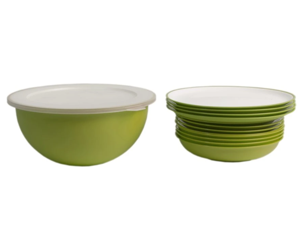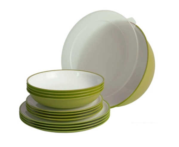 Sada plastového nádobí o 14 kusech, vhodná pro každodenní použití v domácnosti, na zahradě nebo při kempování. Vyrobena ze zdravotně nezávadného polypropylenu s antibakteriální úpravou Microban, která omezuje množení bakterií a prodlužuje čerstvost potravin. Nádobí je odolné proti nárazu a deformaci, snadno stohovatelné a vhodné do myčky, mikrovlnné trouby i mrazničky.