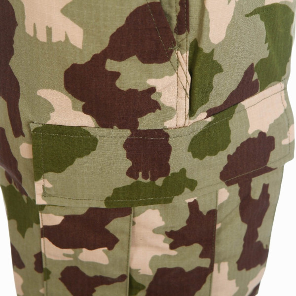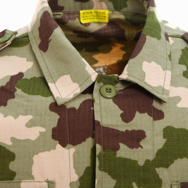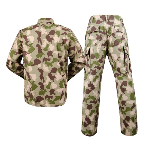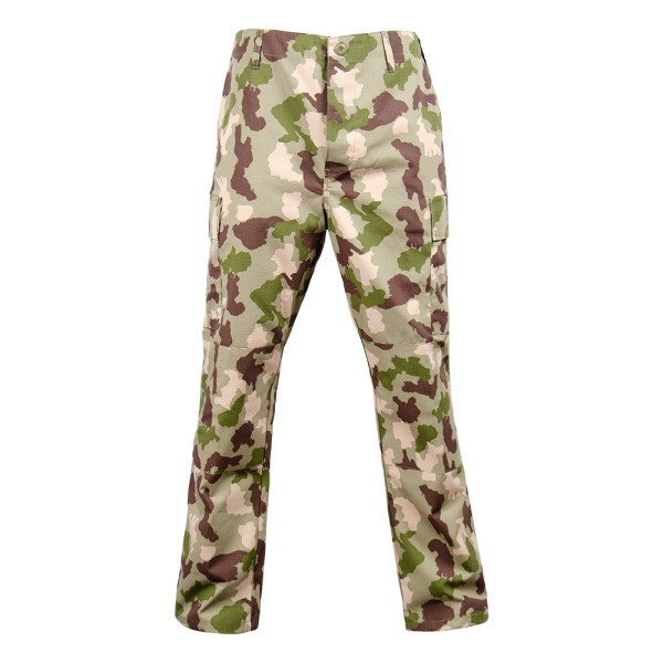Taktická maskáčová souprava (kalhoty a blůza) ve stylu BDU (battle dress uniform). V neobvyklé africké kamufláži. Vyrobeno z pevné tkaniny ripstop. Materiál 65% polyester 35% bavlna.