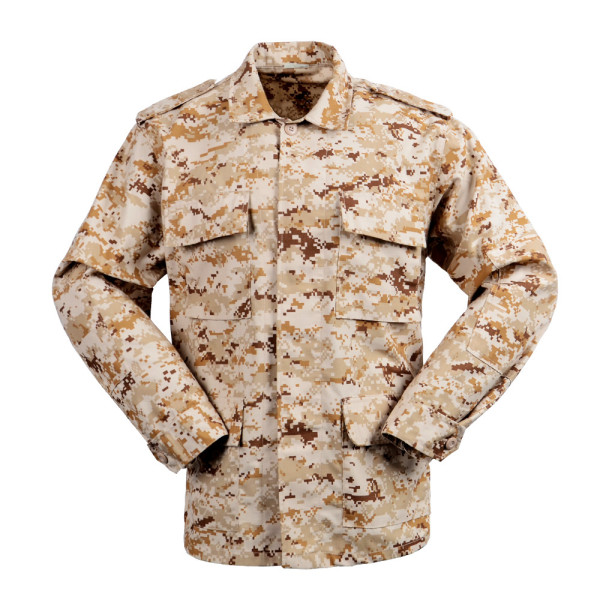 Taktická maskáčová souprava (kalhoty a blůza) ve stylu BDU (battle dress uniform). V kamufláži desert digital. Vyrobeno z pevné tkaniny ripstop. Materiál 65% polyester 35% bavlna.