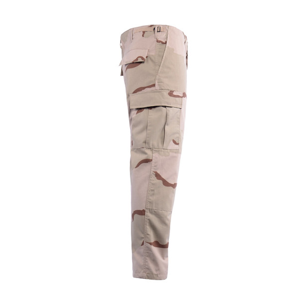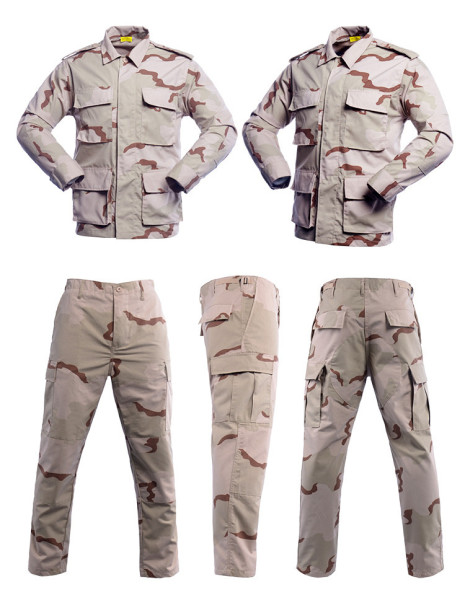 Taktická maskáčová souprava (kalhoty a blůza) ve stylu BDU (battle dress uniform). V trojbarevné pouštní kamufláži. Vyrobeno z pevné tkaniny ripstop. Materiál 65% polyester 35% bavlna.