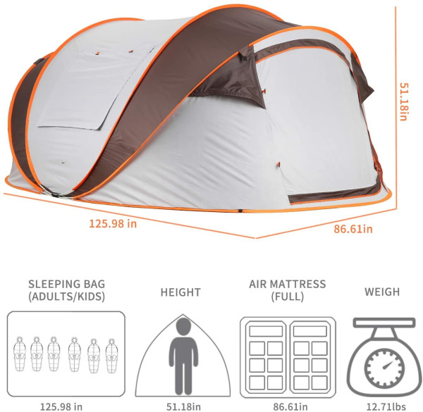 Tento stan spojuje stylový design a moderní funkce. Díky automatickému pop-up systému ho postavíte během několika vteřin. Nabízí dostatek prostoru pro čtyři osoby – uvnitř se pohodlně vejdou spacáky i nafukovací matrace.