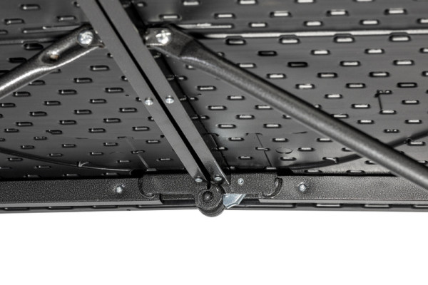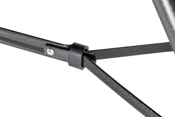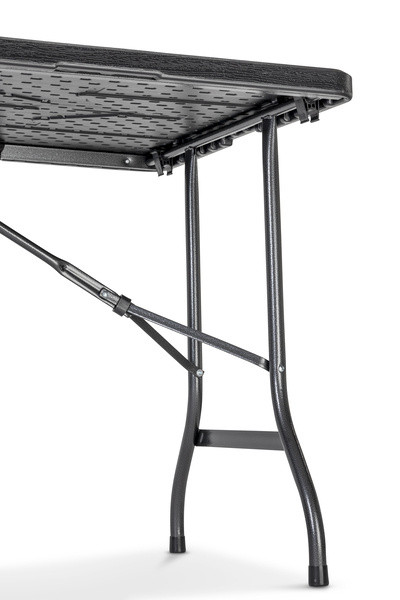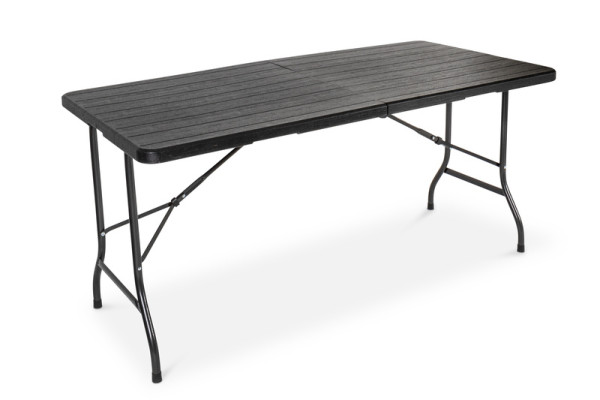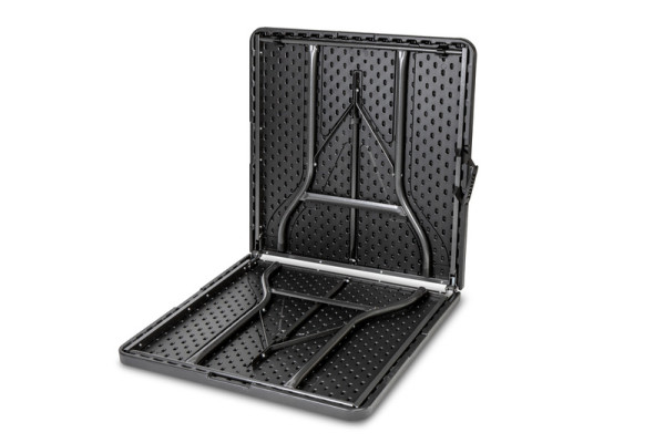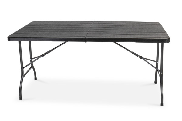 Velký a stabilní skládací stůl ideální pro kempování, zahradní oslavy či bleší trhy. Díky práškově lakovanému ocelovému rámu je vysoce odolný vůči povětrnostním vlivům. Černý povrch s jemnou strukturou dodává stolu elegantní vzhled.