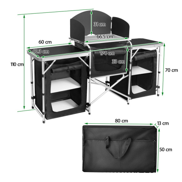 Užijte si pohodlí vaření kdekoliv venku. Tato přenosná skládací kempingová kuchyně kombinuje praktické řešení s robustním provedením. Velký box se skládá a promění v stabilní pracovní plochu se vším, co potřebujete pro přípravu jídla na cestách.Více informací