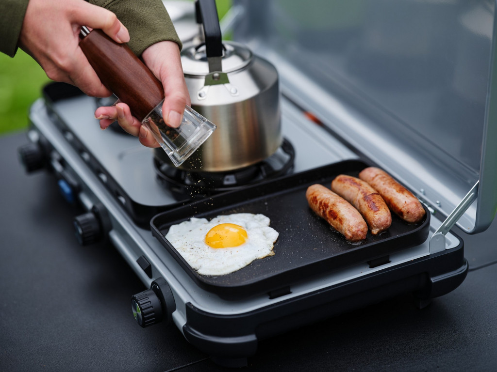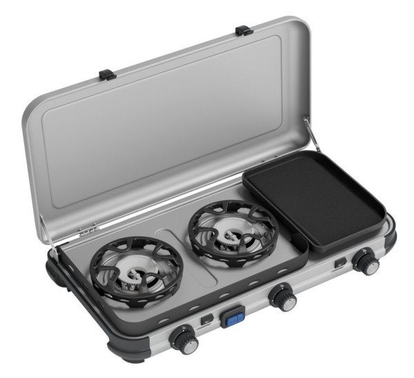 Camping Kitchen 2 Multi‑Cook kombinuje vaření a grilování ve třech samostatně ovladatelných zónách – dvěma výkonnými hořáky a přídavným trubicovým hořákem s grilovací deskou. Díky technologii FlameGuard si vařič zachová stabilní výkon i při větru a snižuje tak spotřebu až o 50 % a voda se vaří až o 30 % rychleji. Piezo zapalování umožňuje okamžité spuštění bez zápalek. Konstrukce s odnímatelným grilovacím roštem a panty přemění vařič na kompaktní kufřík.Více informací