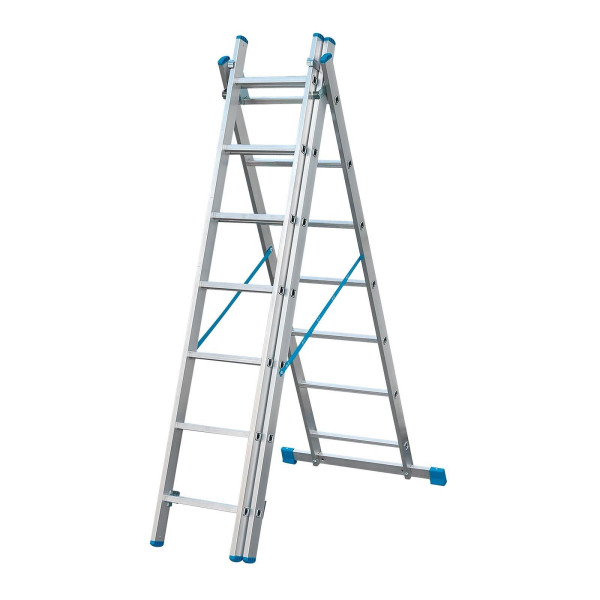 V poloze štaflí nabízí zvětšení dosahu pomocí vysunutí pohyblivého dílu. Žebřík lze postavit na schody, meze a výškově rozdílné terény. Kvalitní hliníkové profily s prolisy umožňují při nízké váze žebříku jeho tuhost při používání. Pojistka pro zajištění jednotlivých dílů žebříku. Možnost využití žebříku ke schodové úpravě.